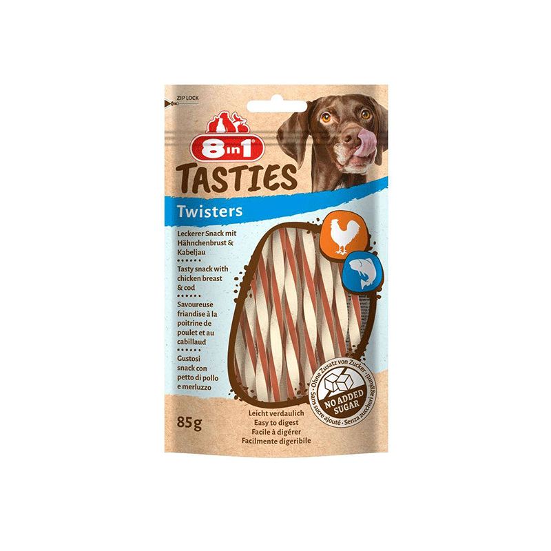 8in1 Tasties Twisters – lengvai virškinami šunų skanėstai su gardžia vištienos krūtinėle, apvyniota menkės mėsa.