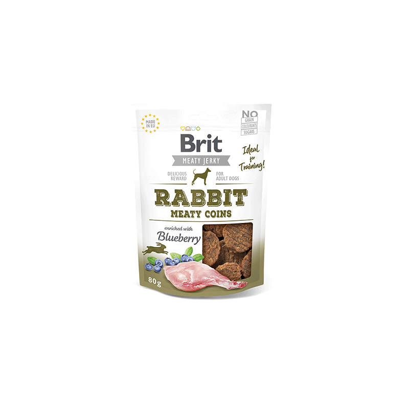 Brit Jerky Rabbit Meaty Coins – džiovintos mėsos skanėstai šunims su 85 % vištienos ir triušienos mėsos.