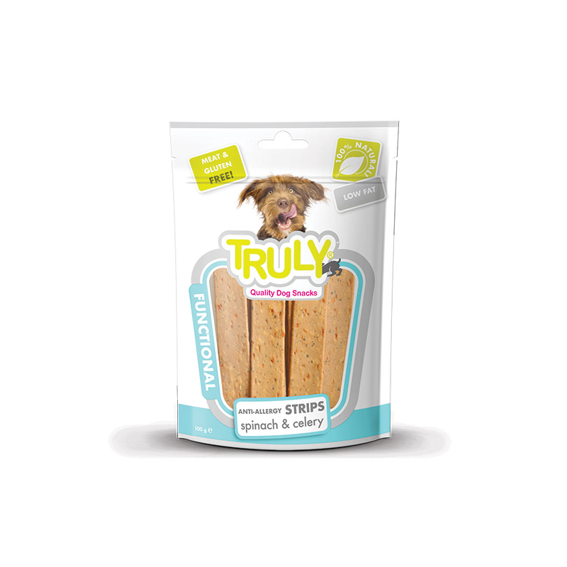 Truly Anti-allergy Strips Spinach & Celery – skanūs ir sveiki skanukai šunims su špinatais ir salieru.