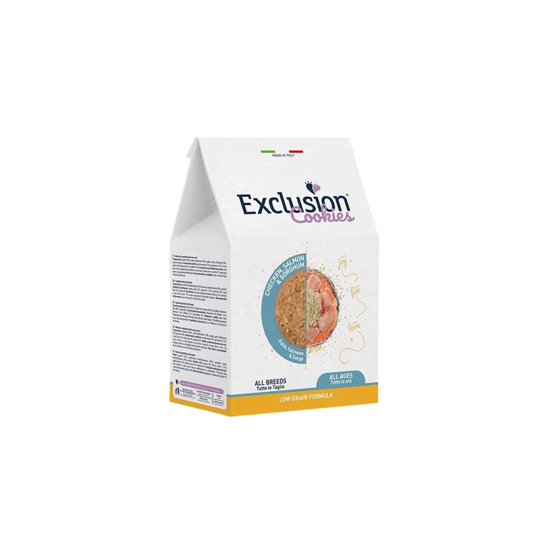 Exclusion Snack Low grain Chicken, salmon and sorghum Biscuits – skanėstai šunims su vištiena, lašiša ir sorgų kruopomis. Sausainiai šunims su nedideliu kiekiu grūdų, puikiai tinkantys visų veislių šunims.