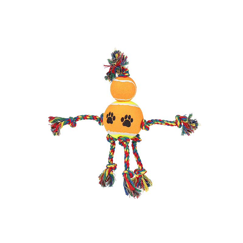 Happet šunų žaislas su kamuoliukais ir virvėmis, pagamintas iš gyvūnams saugių medžiagų ir puikiai tinkantis šunų dresūrai.