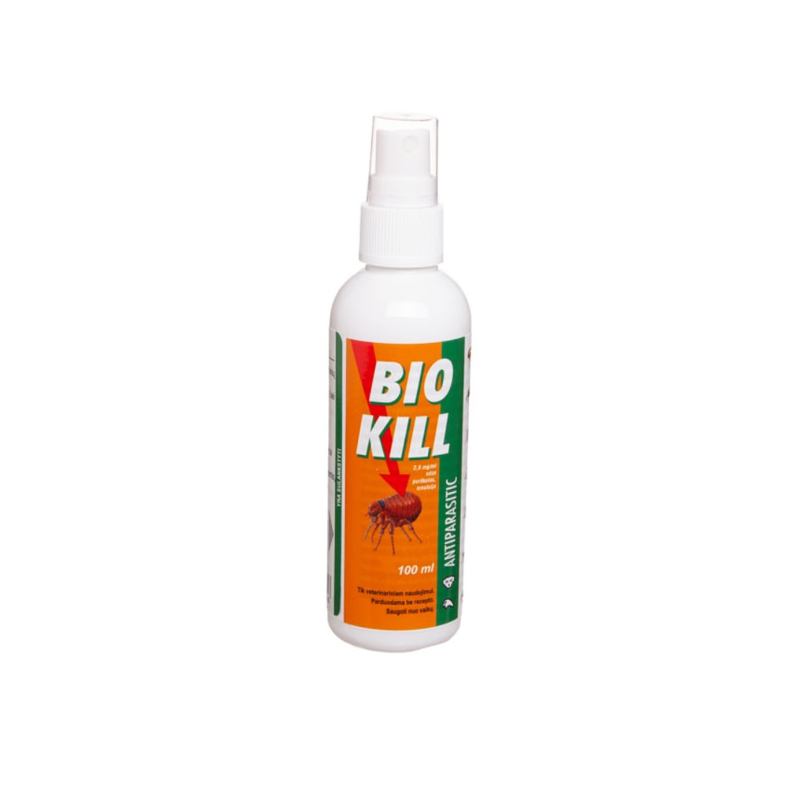Bio Kill antiparazitinis ir insekticidinis preparatas naminiams gyvūnams nuo ektoparazitų, turintis ilgalaikį poveikį. Negalima naudoti katėms.