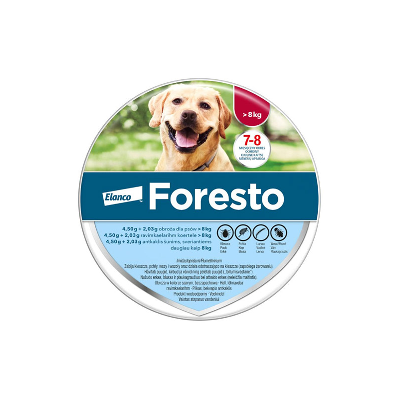 Foresto antkaklis nuo erkių ir blusų šunims ir katėms nuo 8 kg, skirtas ilgalaikei apsaugai. Bekvapis ir atsparus vandeniui.